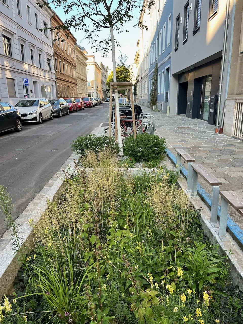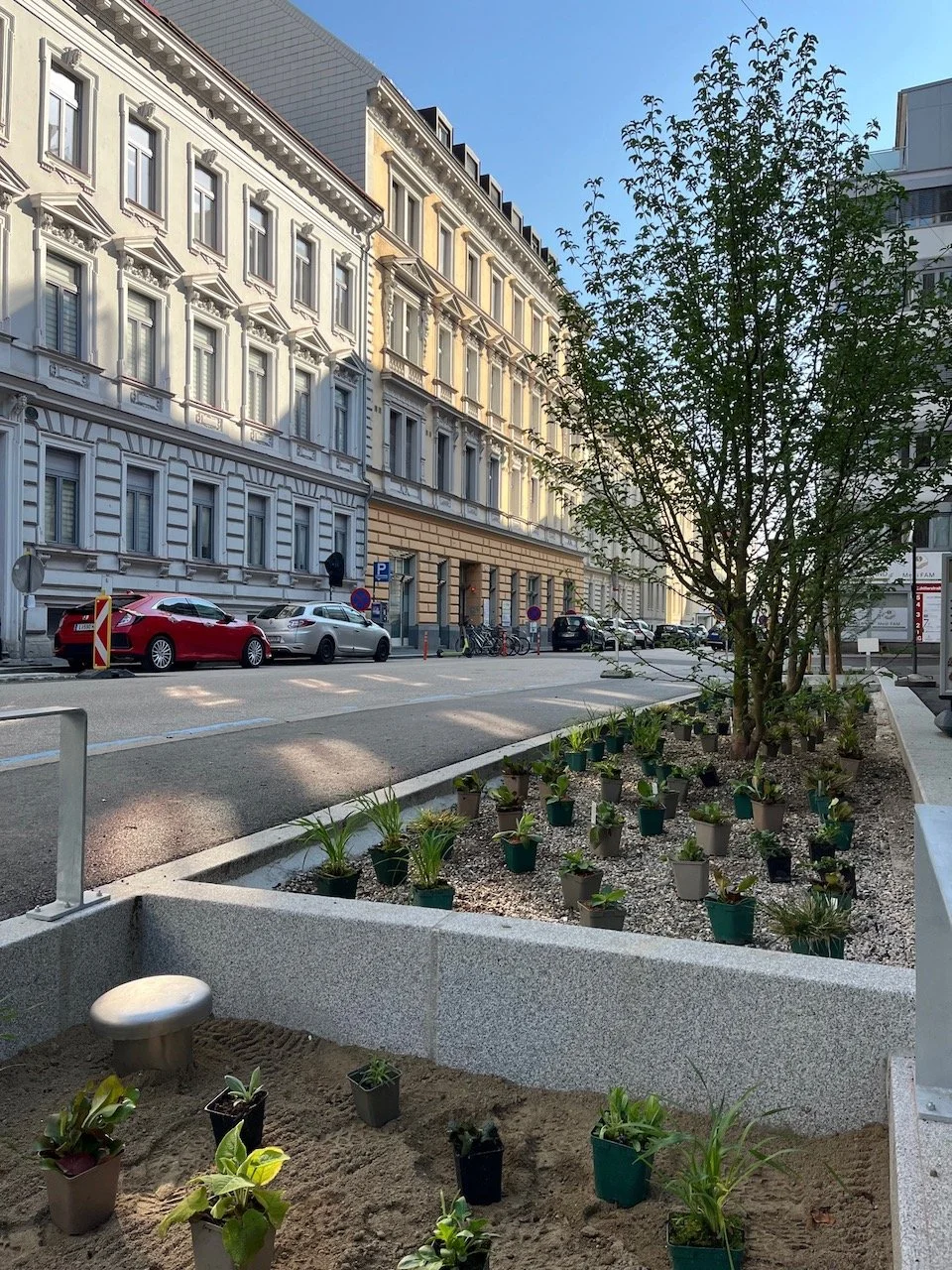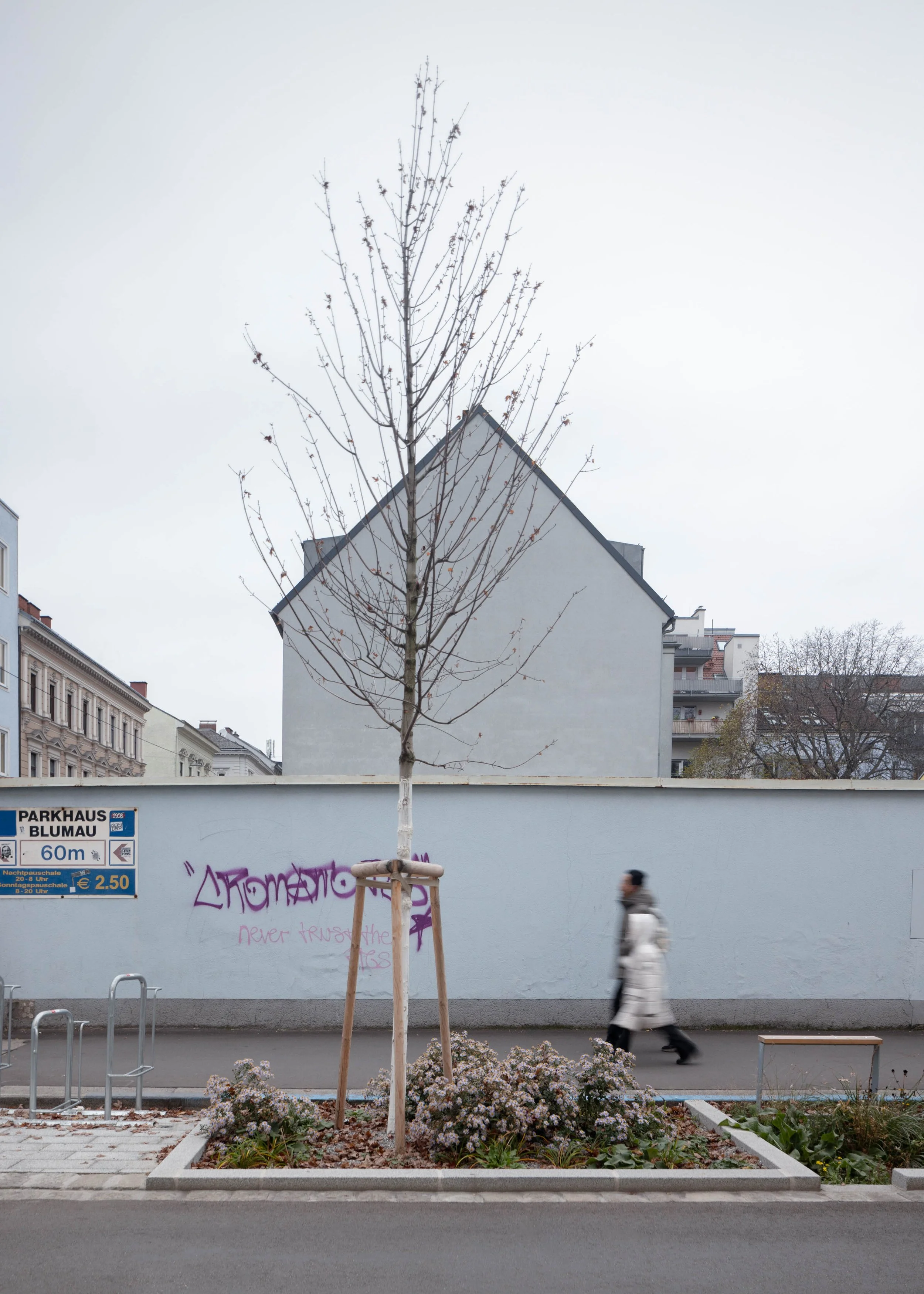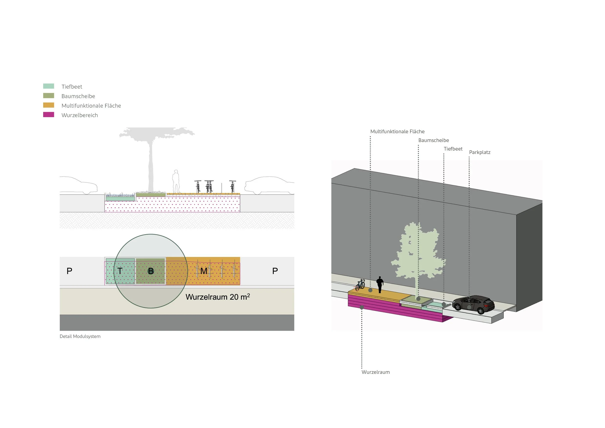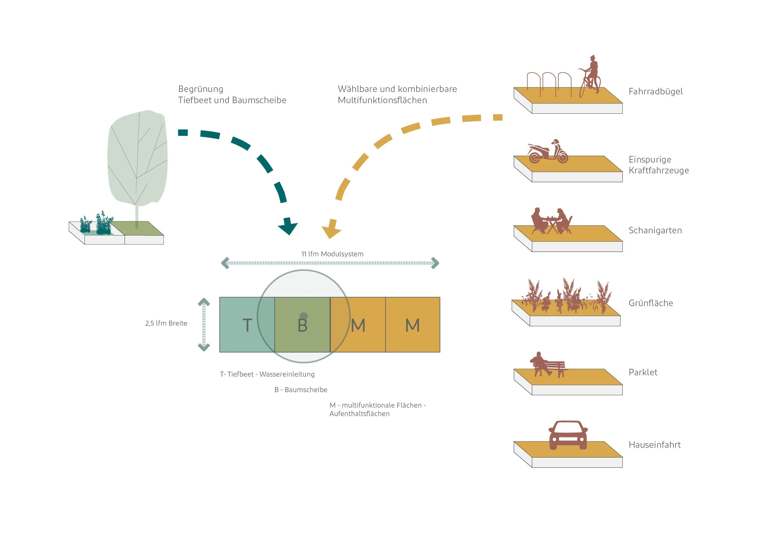 Um die Länge des Baumstandortes effizient zu nutzen, wurde ein Modulsystem für das Neustadtviertel entwickelt. Fixe Bestandteile eines jeden Moduls sind einerseits die Baumscheibe - eine Grünfläche als Standort des Baums - und anderseits das Tiefbeet. Im Tiefbeet wird als Beitrag zum lokalen Regenwassermanagement das Oberflächenwasser aus dem angrenzenden Einzugsgebiet der Straße gesammelt, gereinigt, versickert und dem Baum zur Verdunstung zur Verfügung gestellt. Die verbleibende Multifunktionsfläche bietet je nach Bedarf Platz für diverse Nutzungen: Grünfläche, Fahrradbügel, Hauseinfahrt, Schanigarten, Parklet etc..
