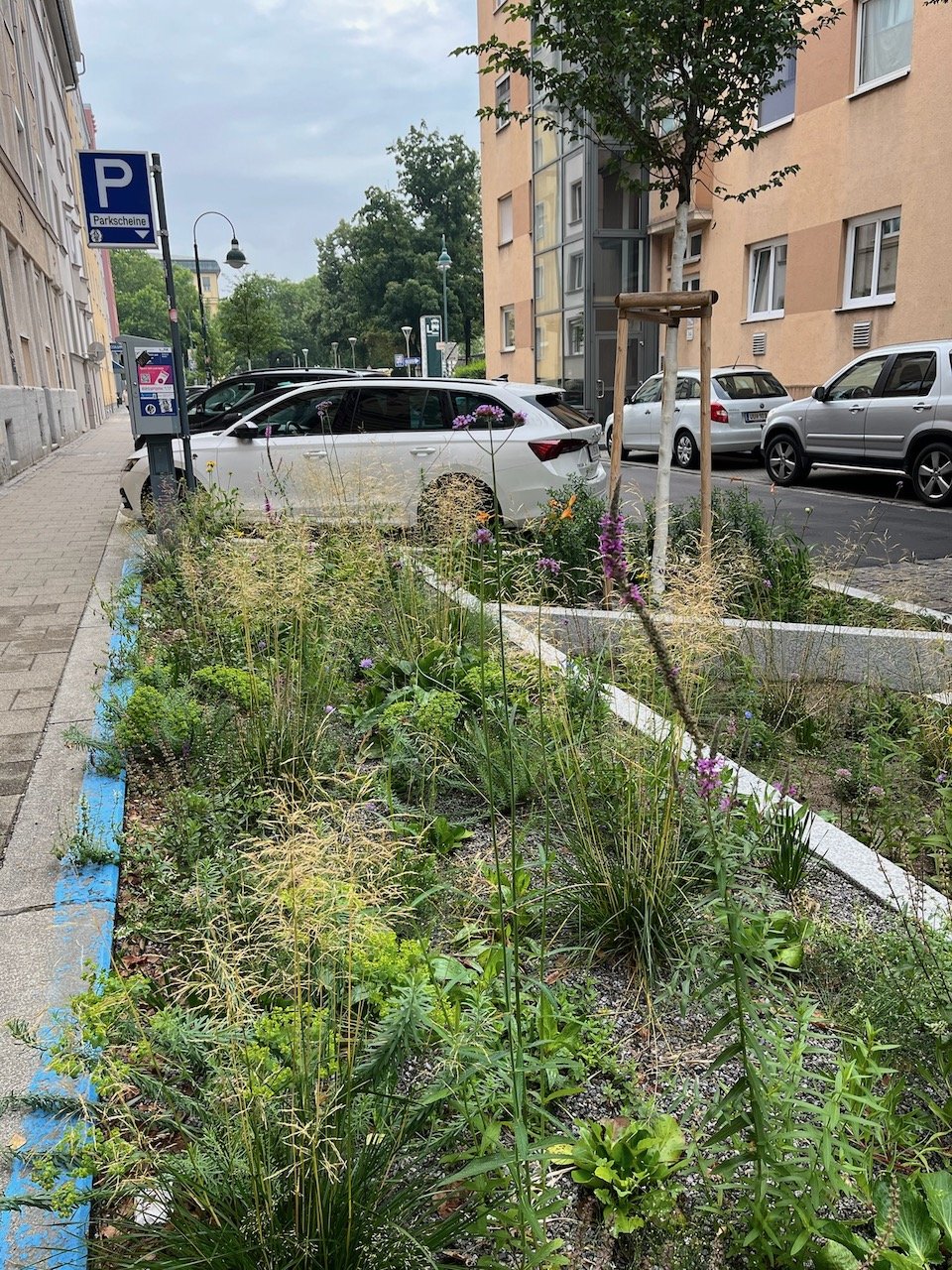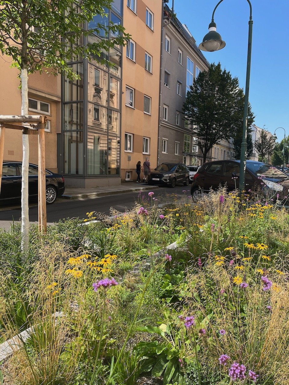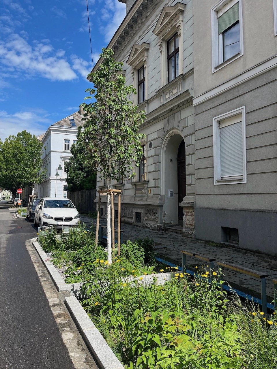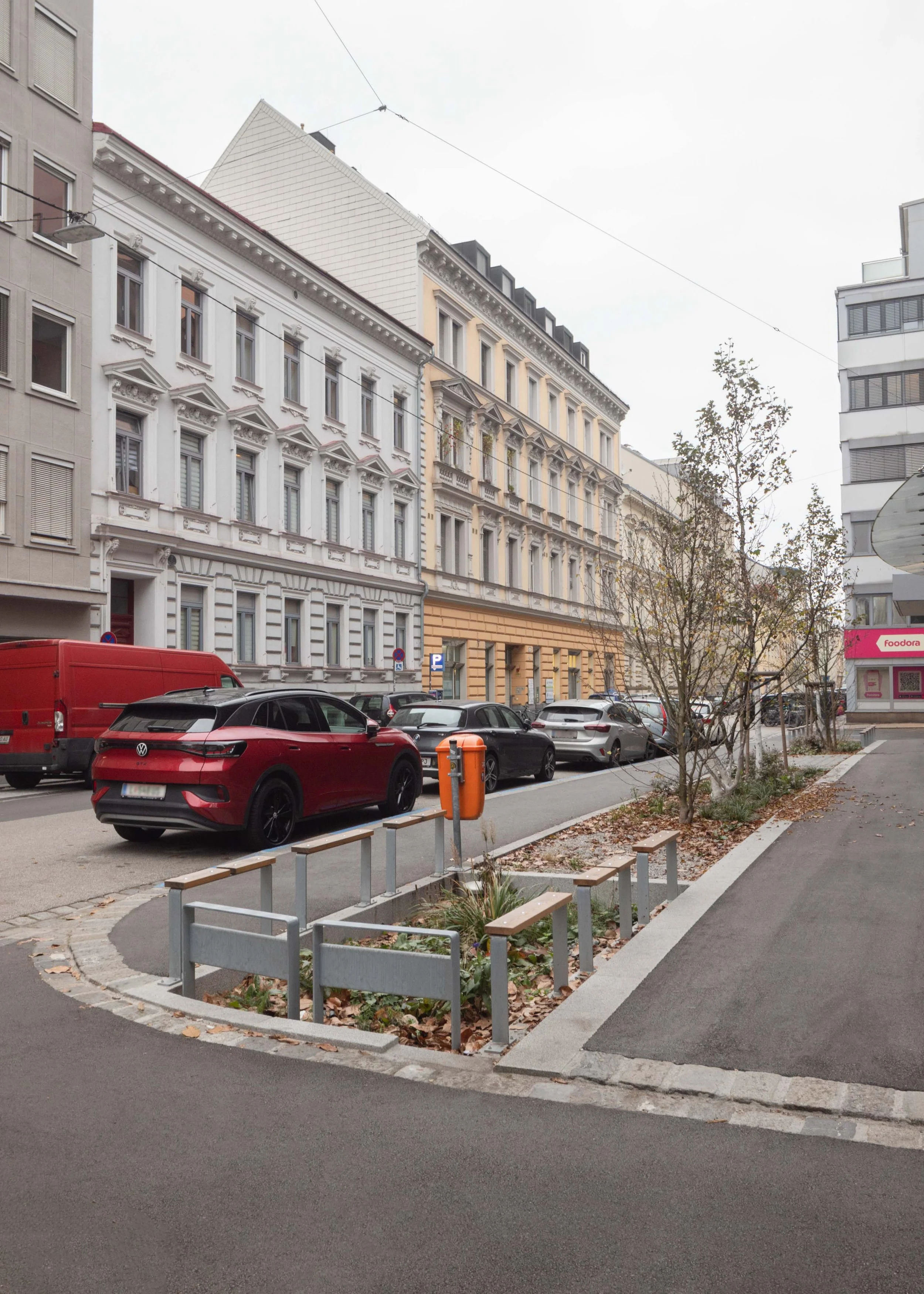 Um die Länge des Baumstandortes effizient zu nutzen, wurde ein Modulsystem für das Neustadtviertel entwickelt. Fixe Bestandteile eines jeden Moduls sind einerseits die Baumscheibe - eine Grünfläche als Standort des Baums - und anderseits das Tiefbeet. Im Tiefbeet wird als Beitrag zum lokalen Regenwassermanagement das Oberflächenwasser aus dem angrenzenden Einzugsgebiet der Straße gesammelt, gereinigt, versickert und dem Baum zur Verdunstung zur Verfügung gestellt. Die verbleibende Multifunktionsfläche bietet je nach Bedarf Platz für diverse Nutzungen: Grünfläche, Fahrradbügel, Hauseinfahrt, Schanigarten, Parklet etc..