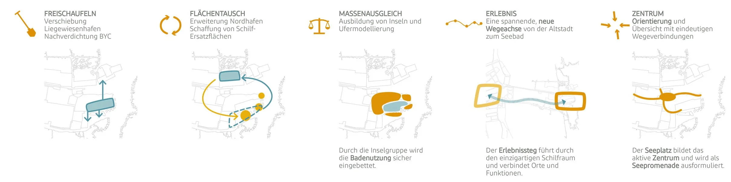 Die vielfältigen Nutzungen werden durch die neuen Zuordnungen sensibel voneinander abgegrenzt, wodurch freie Wasserflächen und klar lesbare Zonen und Funktionsbereiche entstehen.